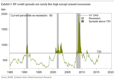 The near default in Venezuela, deepening recession in Brazil and devastation in the energy sector has us also wondering about the vulnerability of bank stocks, with material emerging markets and oil patch exposures for these institutions. If the value of publicly held high yield debt is rapidly deteriorating (as price moves inversely with yield) mustn't the same value deterioration be equally true of these bank loans? JPM Chairman, Jamie Dimon was quick to play down the issue of his bank's risk profile in energy, arguing that the bank is well reserved against potential losses. As if to further comfort JPM investors, Dimon continued to offer that bank loans to oil and gas companies are asset backed; that is, losses would be offset by the realization of collateral.