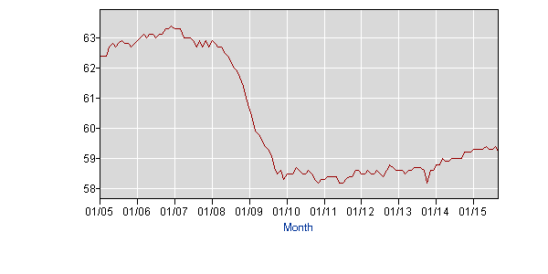 Thus, the unemployment rate has been biased by the steeply falling labor participation rate since 2008. For this reason, the more compelling chart to look at may be the employment to population ratio, also maintained by the BLS.