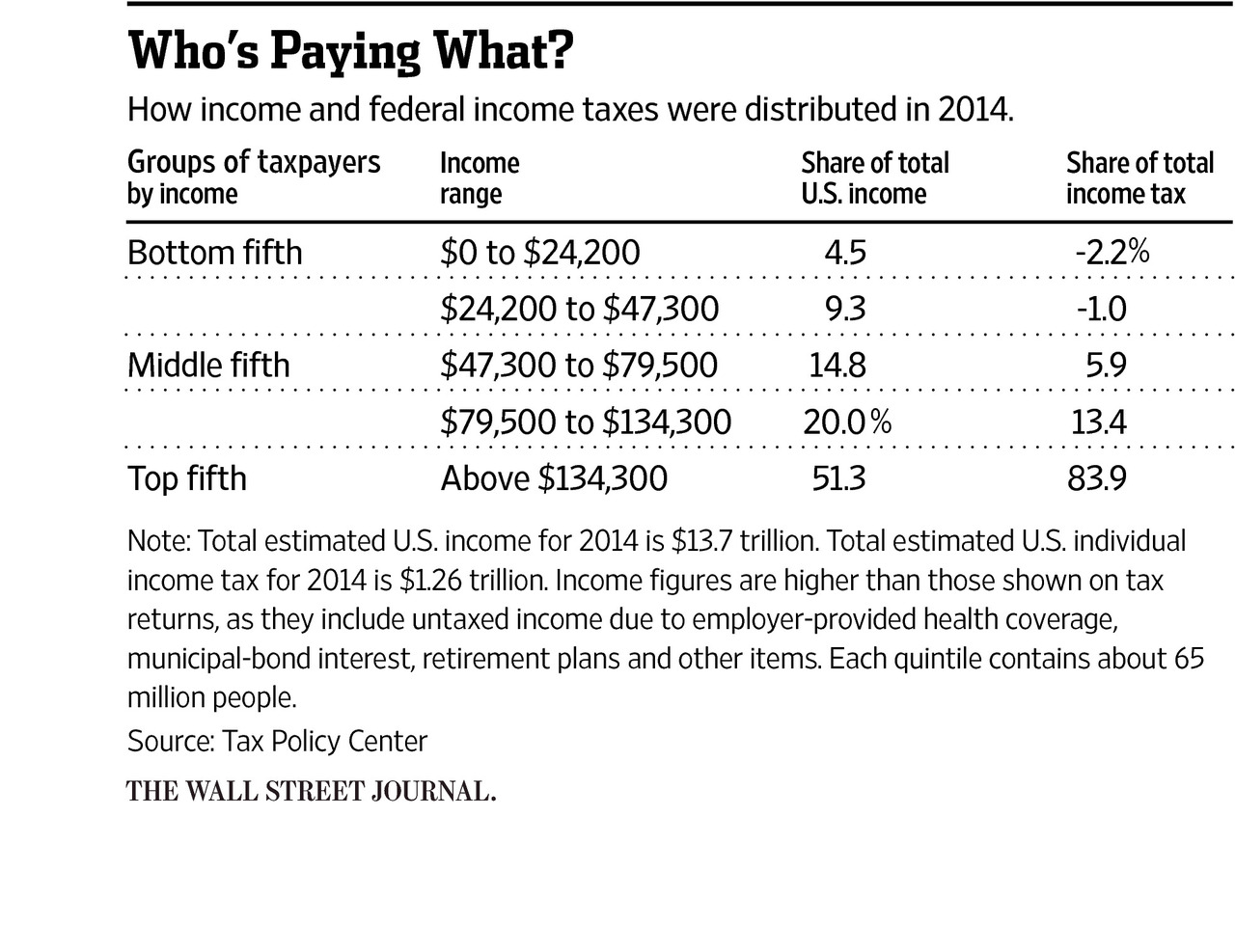 Now the question remains, if 43% of taxpayers pay no federal income taxes, who does pay? Apparently, 83% of the $1.26 trillion in total US income taxes collected in 2014 came from the top 1/5th of taxpayers. The top 20% accounted for 51% of total US personal income and 83% of total personal income taxes (the reason the latter number is higher than the first is, of course, due to the progressive tax system currently in effect).