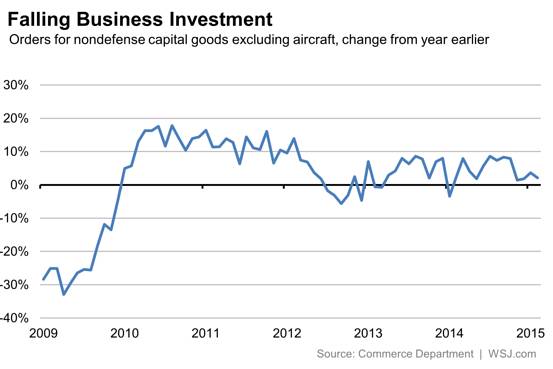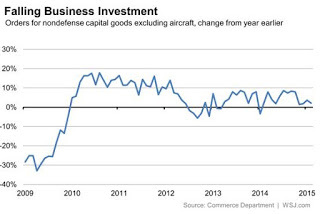 Let's take a look at new business investment in America since the beginning of the recession. After recovering somewhat dramatically in the year following the 2009 recession, the rate of growth of new business investment has leveled off and in fact fallen in recent years. Why? Because companies are not seeing the demand for their products in the US or, increasingly, abroad. Weak demand, weak investment, weak hiring.