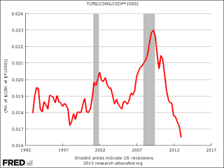 With no bias in the data due to a falling labor participation rate, this chart simply shows the proportion of the population, age 16 and over, that is employed. Now it's true that this chart would be influenced by retiring boomers, but it's hard to believe that 5% of the working population, or 7.7 million people, would have all decided to retire in the two years from 2008-2010. In fact, the first of the baby boomers to turn 65 did not occur until 2011. So something else is clearly responsible for the steep decline in the employment to population ratio in the first two years of the great recession.