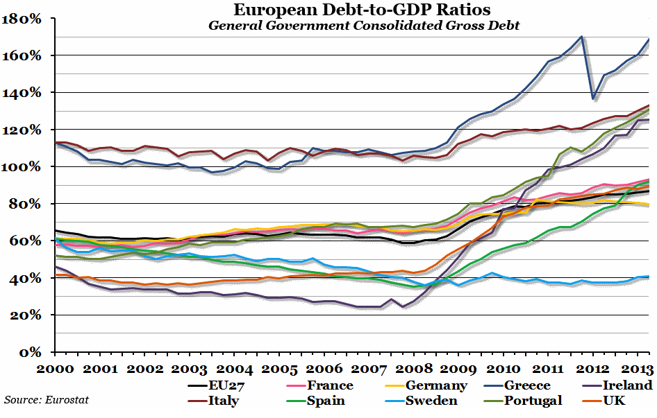 One of the most widely used metrics for analyzing the level of debt of a country or sovereign government is Debt to GDP. The idea is that in comparing the overall government debt of Japan to China, for instance, the absolute amount of government obligations needs to be viewed in the context of the size of the economy, as measured by Gross Domestic Product. Countries with larger economies, like the US and China, can sustain higher levels of debt, because the tax base available to them for servicing the debt is so much bigger than, say France or Portugal.The World Bank publishes Debt:GDP ratios for all major industrialized nations as well as developing economies. Alarms began to sound in 2010 over excessively high levels of debt to GDP in Greece. By 2012, the last year of World Bank published data, the debt to GDP ratio for Greece had climbed to 167%. More economically stable economies like that of Denmark, Finland, Germany, Australia and Canada, have ratios in the range of 50%.