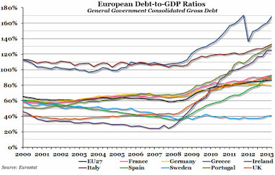 Amidst these "problem" economies, the US shows a ratio of 96% as recently as 2013 in the World Bank analysis. This figure reports what is known to as "gross debt", a number that is also often reported on a net basis. The difference between net and gross is the treatment of debt the US government owes to "itself" or specifically Medicare and Social Security. This topic is discussed at length in other blogs on this site.