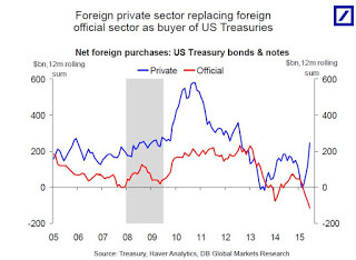 There's been more than a little attention devoted to this question lately. The concern follows reports that China has been selling portions of its massive US Treasury holdings to support a destabilized Yuan. Marketwatch had a nice piece this morning that should dispel much of investors' concerns. This chart from Marketwatch shows net flows of foreign private and official sector purchases of Treasuries. Despite recent selling pressure, private sector purchases appear to be more than offsetting the selling of foreign governments.
