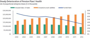 The news followed recent downgrades of the City of Chicago in May 2015 to junk bond ratings. In lowering the city’s rating, Moody’s Investors Services cited “the city’s highly elevated unfunded pension liabilities” continuing, “we believe that the city’s options for curbing growth in its own unfunded pension liabilities have narrowed considerably.” This thus points to the most troubling concern about public employee pension liabilities: that even well-intentioned efforts at pension reform may take years to slow the growth of unfunded liabilities.