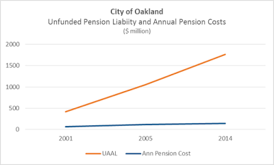So this is about where I thought this story would end. The city's annual pension costs had risen from $66 million in 2001 to $148 million in 2014 (inclusive of debt service on POBs), while its unfunded pension liability had grown from $417 million to $1.7 billion (inclusive of POBs). But here's what I didn't expect to find: how well the city administrators and elected officials would address these costs.