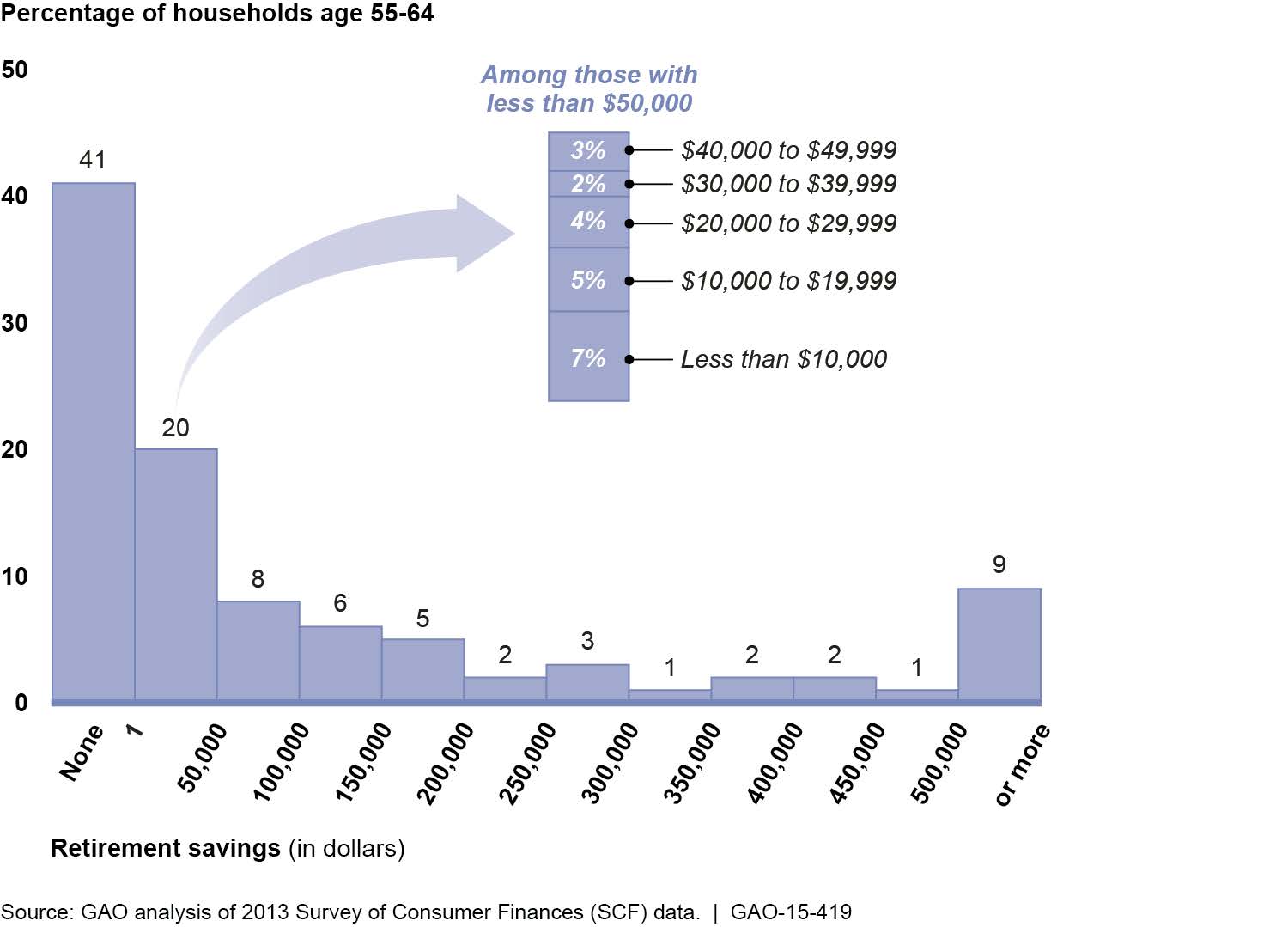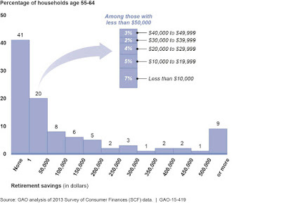 The Government Accounting Office just released a new report on retirement security. Their conclusion: most households approaching retirement have very low savings. Just how low, though, is startling. Among households age 55 and older, one-half have no retirement savings at all in 401(K), IRA or similar defined contribution accounts. Similar findings were reported in a 2013 study of the Federal Reserve Bank, along with the fact that for those age 55 and older that do have retirement accounts, the median balance was just $111,000.