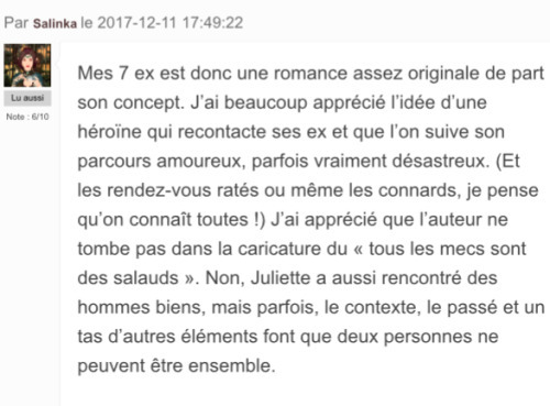 “J’ai apprécié que l’auteur ne tombe pas dans la caricature du « tous les mecs sont des salauds ». Non, Juliette a aussi rencontré des hommes biens, mais parfois, le contexte, le passé et un tas d’autres éléments font que deux personnes ne peuvent être ensemble.”