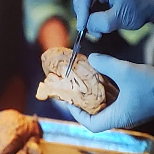 Some participants were shy about this part, but many were drawn in as I was. Rubber gloves were passed around, as I focused, craning to see as Dr. Steve removed the meninges, the connective tissue covering the brain and spinal cord. It was a darker color and so tough, with no elasticity.