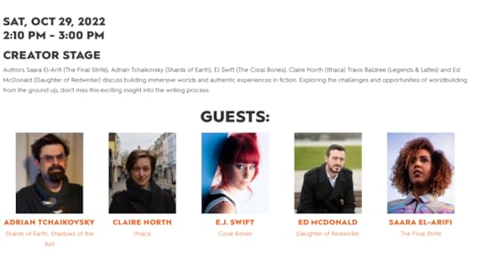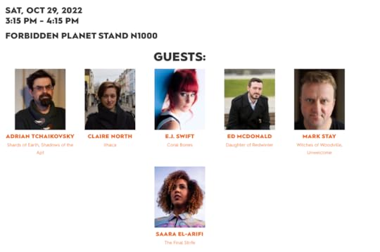 I’ll be at the MCM Comic Con in London on Saturday 29th October. First, I’m moderating a panel on Worldbuilding with these wonderful authors…
