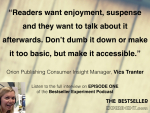 My favourite bit comes 23m 30s in, where I flippantly announce the end of the podcast. We had to make it clear to listeners that we weren’t cynically trying to custom-build a bestseller. I’d been tipped off that a book called The Bestseller Code was coming soon, and already it was getting a bad buzz in the industry. We wanted to avoid comparisons with any kind of bestseller-by-numbers approach. It’s a criticism that we still get, and understandably, considering what we decided to call the show, but I didn’t want this to be a nuts and bolts, insert tab A into slot B operation. If my name is going on the cover of a book, it’s going to be as good as I can make it.
