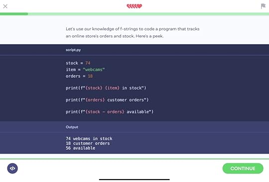 What do I like about Mimo?Though Python has a rich repository of resources (consonance, everyone!), for a beginner, they may be overwhelming. Since using the app, I have learned a number of concepts in Python that I can easily recall aside from