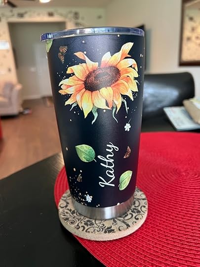 Inside, was a black travel mug, adorned with a sunflower and a pithy 21st century quote about being your strong self and such. You know. Girl power and all that. On the other side, was my name: Kathy.
