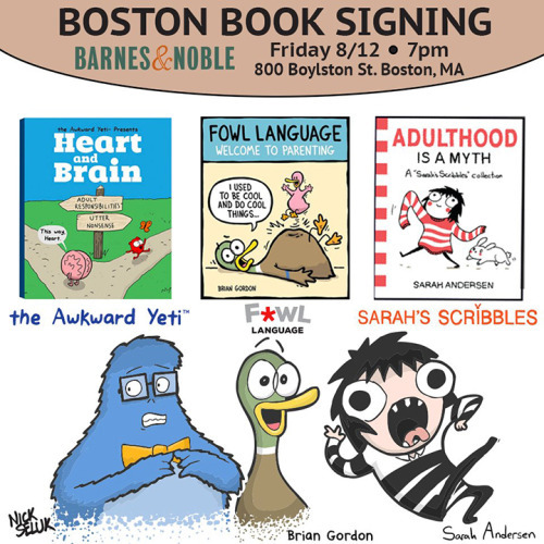 On Friday 8/12, I’ll be doing a book signing with Nick Seluk (The Awkward Yeti) and Brian Gordon (Fowl Language Comics) at 7PM at the Barnes and Noble on 800 Boylston St.