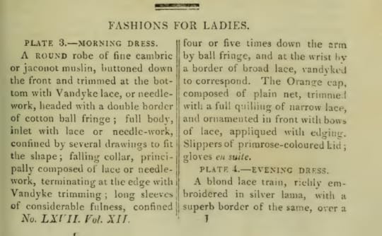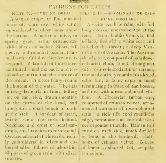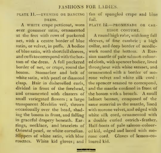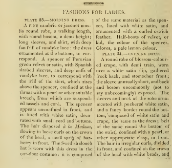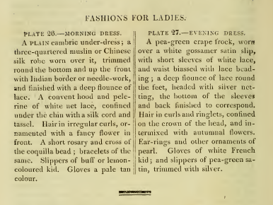 At first, I thought that the lady of plate 27 might be holding a newspaper, something I would have been very excited to see. But, realizing she was attired in “Evening Dress,” and that the sheets in her had seemed to be separate, rather than folded as a newspaper would be, I thought it more likely that a collection or book of sheet music might be intended here. She would make a lovely figure sitting down to the piano-forte in her pea-green gown, with its “deep flounce of lace round the feet, headed with silver netting.”