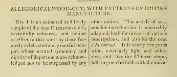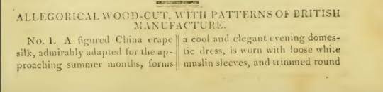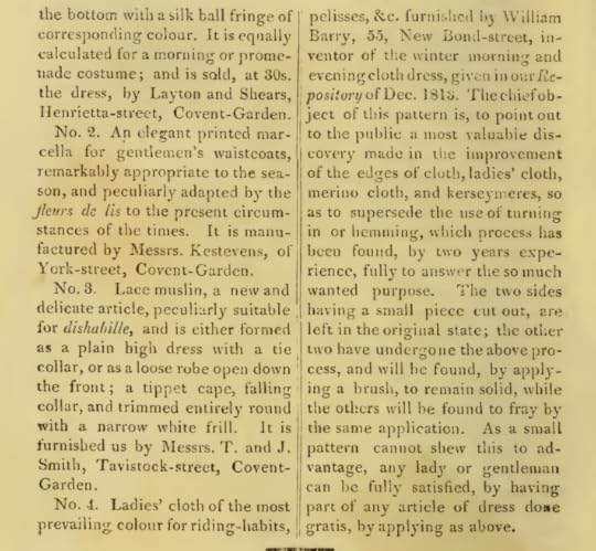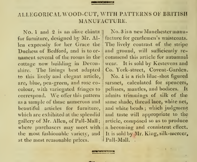I’m drawn to fabric sample #4, described as a “rich lilac-shot figured sarsnet, calculated for spencer, pelisses, mantles, and bodices.” The sample looks more pink than lilac to my eye. The zig-zags topped with what look to be tiny French knots make for a very unusual fabric, one that would have had me hieing off to Mr. King’s silk mercer shop. And since his shop is also in Pall-Mall, perhaps I would have also taken a peek into Mr. Allen’s?