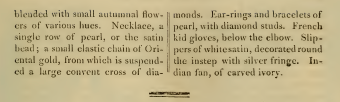 Both prints show their models wearing their hair in loose curls, curls adorned with “a small sprig of barberry” in the informal morning dress, and “small autumnal flowers of various hues” for the formal evening dress. Real flowers, I wonder? Or artful imitations?
