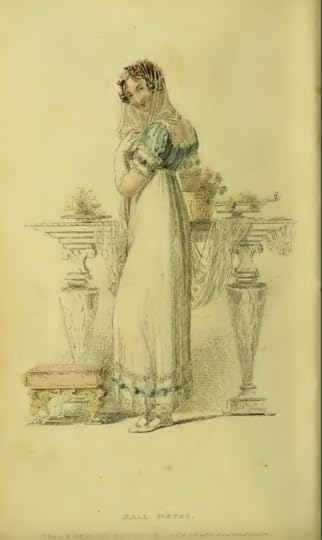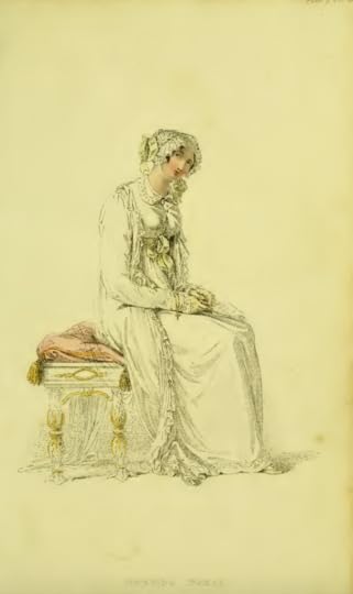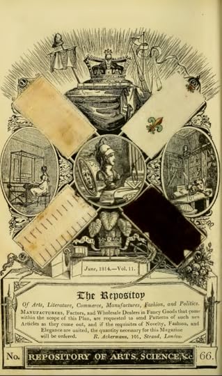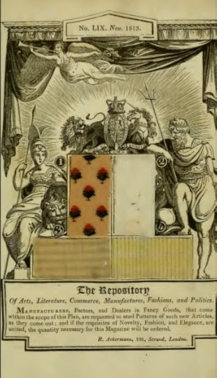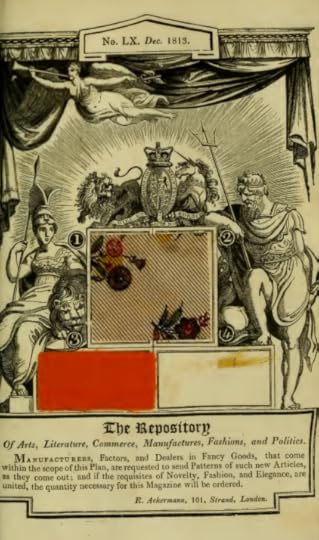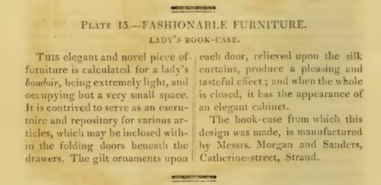 While I don’t usually include furniture prints in these posts, I couldn’t resist adding this one, which features a decorative ladies’ book-case. I found its folding doors and lots of drawers for storing all those little things a Regency lady might need to keep close to hand in her boudoir quite appealing. Too bad there are no titles visible on the books collected in this gilt-adorned piece of furniture—I would have liked to have known what titles Ackermann’s thought Regency ladies of 1814 would most likely keep close to hand . . .