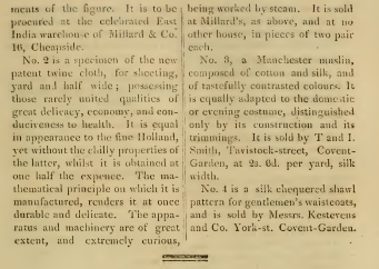 Fabric sample #2 may not look as interesting, a simple “specimen of the new patent twine cloth, for sheeting,” but its method of production is “extremely curious,” as the machine upon which it is produced is “worked by steam.” Steam-driven power looms had first been built in 1785, but this aside suggests how novel they still were in the Regency period.