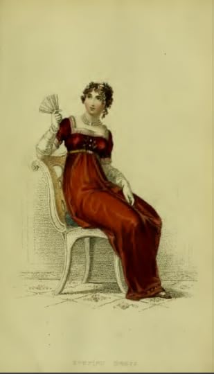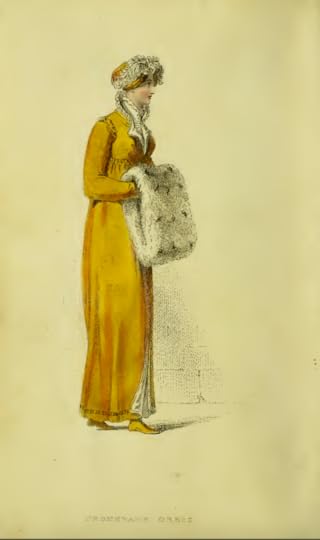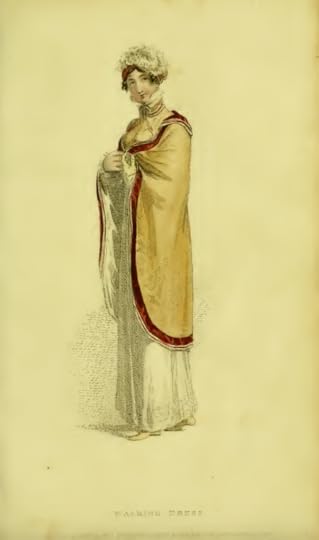 I got a bit excited when I saw the lady in Plate 12; at first glance, it appears she has red hair! (yes, I’m a redhead, and proud of it). But alas, the splash of color is merely the “morone velvet” lining the lady’s “helmet bonnet,” which matches the trim on her Russian mantle. When you look more closely, you can see that her hair is a very ladylike brown. I should have known better; despite the many historical romance novels that feature redheaded heroines, prejudices against red hair that had been prevalent since the Middle Ages (red hair being associated with Jewishness) had not at all abated by the Regency.