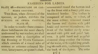This month’s two fashion plates are really two views of one outfit: the Promenade or Carriage Costume of plate 40, which, when “divested of the spencer, or jacket, exhibits” the Evening or Opera Costume pictured in plate 41. Both here are crafted of “morone or crimson-colored Merino, kerseymere, or queen’s cloth,” to keep the wearer warm during the first month of winter. Fairchild’s Dictionary of Textiles defines “queen’s cloth” as “a term used in Jamaica, West Indies, for a type of fine, bleached cotton shirting,” which seems an odd alternative for Merino or kerseymere; perhaps “queen’s cloth” meant something different to the readers of Ackermann’s?