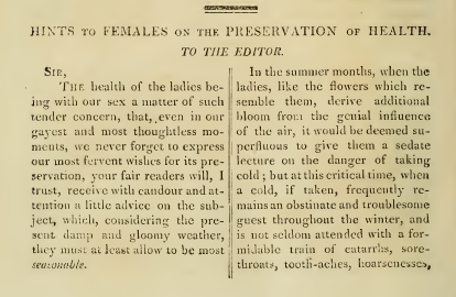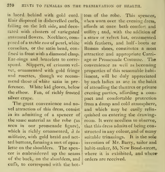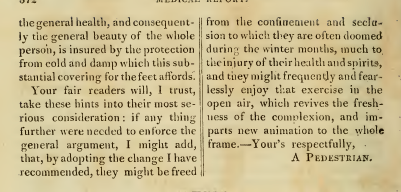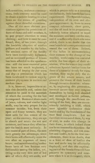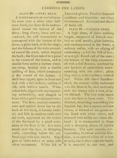The subject of footwear continues in the curious article which follows the fashion plate descriptions, entitled “Hints to Females on the Preservation of Health” from one signed “A Pedestrian.” Pedestrian notes that while boots made from jean, velvet, or similar light stuffs are appropriate for summer wear, women should take a page from men’s fashion and adopt footwear made from sterner stuff for the winter months. In particular, our author recommends Spanish leather, which, “from its more compact substance, close grain, and the oil used in its preparation” is “infinitely better adapted to repel the moisture and keep out the wet.” Ladies need not worry that they will have to trade fashion for utility, for “there is no doubt, that in a boot or shoe of leather the foot and ankle may be effectually displayed; and that this captivating part of the female form will best preserve its symmetry and neatness when it is so decorated.”