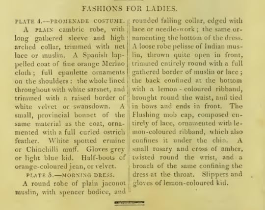 Plate 5 features a white “Morning Dress,” which, with its lemon-colored trimmings, slippers, and gloves, makes for a complimentary companion to the striking orange of plate 6. I’m wondering just what a “Flushing” mob cap is—anyone have any ideas?
