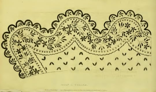 No fabric samples this month, just a detailed needlework pattern (perhaps for the collar adorning this month’s morning gown?)