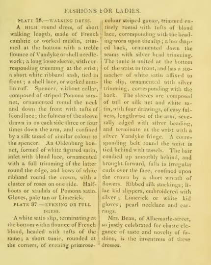 No such hiding for the lady in Plate 37, “Full or evening dress.” Her gown is cut quite low in the back, and adorned with silver beads down the back seams of the bodice, an ornamentation I’ve never seen before in a Regency-era fashion plate. Have you?