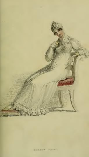 Sleeves in the spring of 1814 are “not so full as of late,” the description of plate 24 notes, although it is difficult to discern just how full said sleeve is, as it is covered by the lady’s mantle. I’ll keep an eye out as I post the rest of 1814’s plates, to see if this trend for less full sleeves continues.