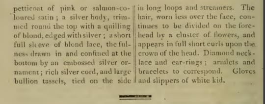 This month’s evening dress begins with the extravagance of “a blond lace train, richly embroidered in silver lama, with a superb border of the same.” It is a bit difficult to see the details of the lace train in the actual print, so I’ve added a shot of a dress in the V&A Museum c. 1820, which features blonde lace as a trim, below the print. This gown features gold, rather than silver, embroidery, but you can imagine a similar effect. The Ackermann’s gown has the additional feature of “rich silver cord, and large bullion tassels, tied on the side in long loops and streamers”—handy for fidgety fingers no doubt, but all too likely to catch on passing furniture, I fear!
