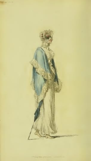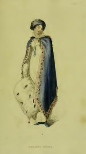 To keep warm in the chilly days of February 1813, ladies are recommended to don cloaks with a military flair. In plate 13, a Cossack cloak, of “pale Russian flame-coloured cloth” covers the fashionable Evening Dress, while a “Prussian hussar cloak, of Sardinian blue velvet” with a “variegated ball fringe” protects the lady from wintry winds during her morning walk. The “Russian flame-coloured cloth” also featured in last month’s fashion plate; I haven’t been able to discover just why this color, which appears in the plates more as a tan than a red, should be labeled “Russian.” Perhaps because during Napoleon’s invasion of Russia in 1812, the cossacks were ordered to burn the villages, towns and crops as they retreated, so that the French would not be able to live off the land they were invading?