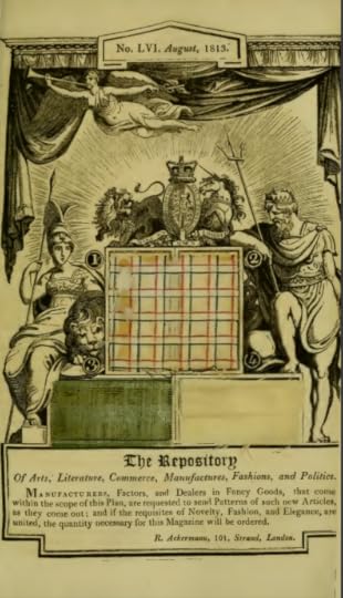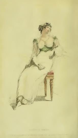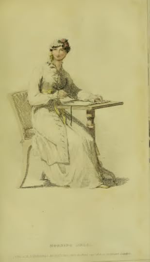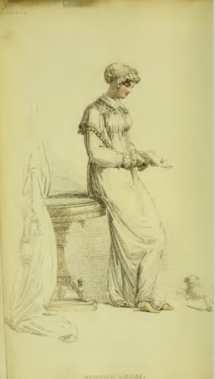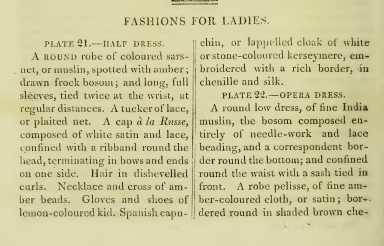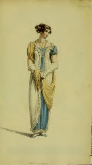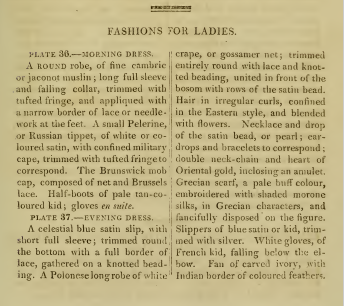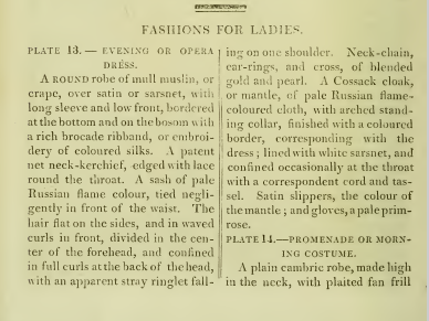 For the first time, a plate is missing from the scans of Ackermann’s I’ve downloaded via Archive.org. The September 1813 edition scanned includes plate 19, “Evening costume,” but the page where plate 20, “Promenade Costume,” should be is blank. A victim of the habit of people cutting the plates out of magazines, even those in library collections, and selling them separately? Today such prints can be purchased for between $30 and $60 from rare print dealers online.