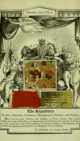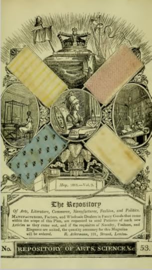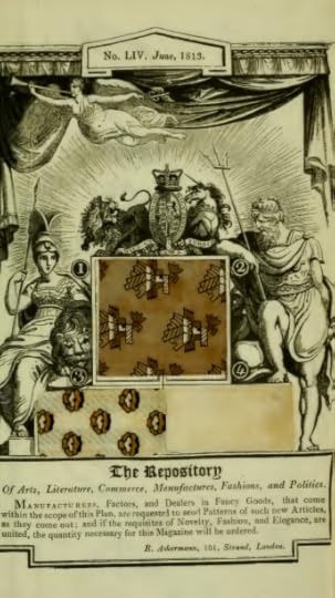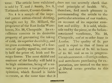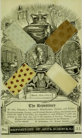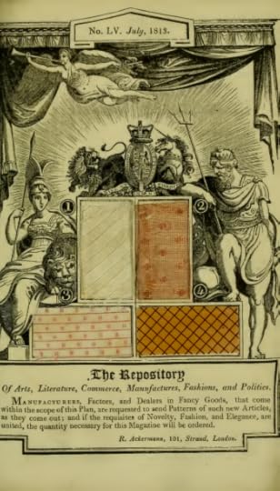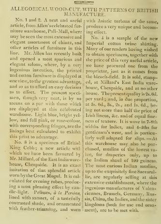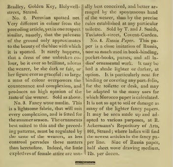 Second is Mr. Millard’s East India warehouse in Cheapside, which is advertised as having “Imperial cotton twine shirting” that can be found at no other house, as well as a wide variety of muslins, from “the lowest value, for draperies only, up to the Indian shawl of 100 guineas.” Did Mr. Ackermann get a cut of Mr. Millard or Mr. Allen’s profits, if their customers mentioned where they had heard of them, I wonder?