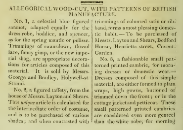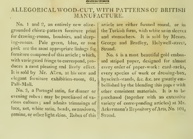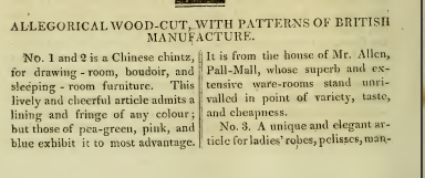 June’s fabric samples seem to designed to puff two particular warehouses. First, “Allen’s celebrated furniture warehouse” in Pall Mall, which has “recently built and spend a most spacious and elegant saloon, where, by a very ingenious invention, the printed and cotton furniture is displayed at one view, to the greatest advantage, and so as to afford an easy decision as to effect.” I wonder what that “ingenious invention” might have been?