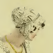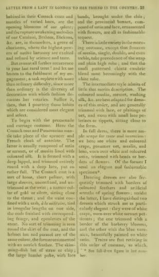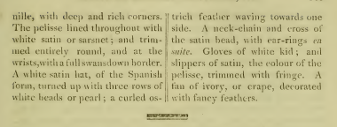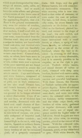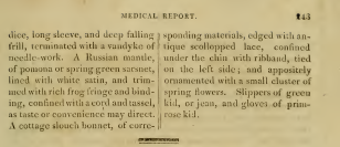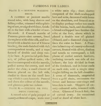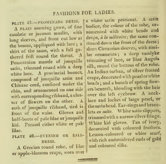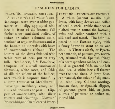 • Fashionable headgear includes the “skimming-dish hat of straw or chip”; the “large hamlet poke, with lace bands, brought under the chin”; and “the provincial bonnet, composed of satin and lace, ornamented with flowers”