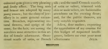 • Trains are beginning to “revive” in dancing dresses, although our young lady fears “they can never be admitted in the dancing dress, without infringing on good sense and good taste.”