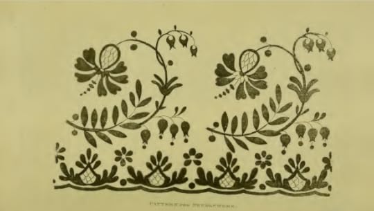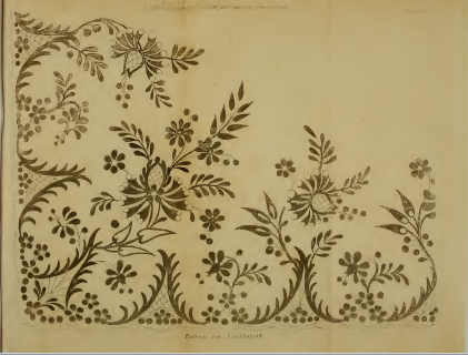 This month’s issue includes no fabric samples, but instead this lovely pattern for needlework. Can you imagine spending a rainy spring afternoon adding this pattern to the hem of a gown?