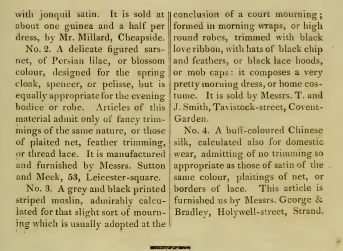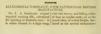 This month’s fabric samples are all intended for domestic or morning wear, including a “Smolensko striped imperial washing silk.” Was said silk imported from Smolensk, one of the cities that Napoleon had invaded during his ill-fated invasion of Russia a year earlier? Purchasing such a product would be a sign of patriotism, would it not?