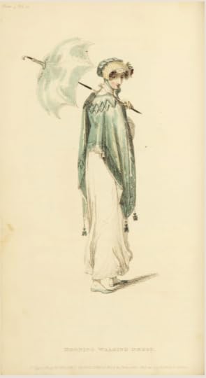 A Pinterest Board titled “1813” includes a (cropped) image of the print in question, so I’ve borrowed a copy from there. Our fashionable lady looks quite comfortable, reading her book with her “large Eastern parasol, with deep Chinese awning,” doesn’t she? I do wish the prints gave us a better idea of the shoes mentioned in the descriptions; I’d like to see if/how the “Roman shoe, or Spanish slipper” differed from a typical English lady’s slipper…