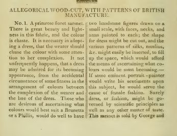 March’s “Patterns of British Manufacture” are all fabrics, three dress materials and one of linen shirting. The latter, despite being sold by the “East India Warehouse,” is apparently an English manufacture, for Ackermann declares it “of a quality equal to, and nearly half the price of Irish and foreign linens.” And it “prevents[s] a too profuse perspiration” to boot!