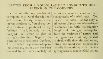 As I mentioned in last week’s post, the July 1813 edition of Ackermann’s Repository featured in addition to its fashion plates a “Letter from a Young Lady in London to Her Friend in the Country,” a letter replete with information on the latest in urban fashion. Some key shifts in fashion our Lady reports:
