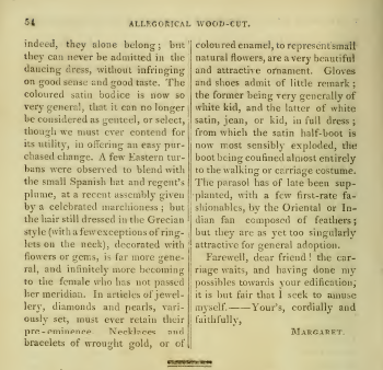 The wearer of the Evening Dress also wears “a double neck-chain and heart of Oriental gold, inclosing an amulet.” Is there something special about “Oriental” gold? And what kind of amulet does that heart of gold “inclose”? Lots of potential for secret messages and codes here, don’t you think?