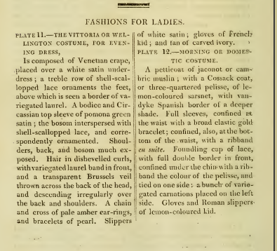 This month’s fashions celebrate Wellington’s June 1813 victory at Vittoria, which led to the collapse of French rule in Spain. The evening dress in Plate 11 is labeled “The Vittoria or Wellington Costume,” although I don’t think there is anything in particular about its design that would lead one to think of either the English general or the town in which 1813’s battle was fought. Is a dress with “shoulders, back, and bosom much exposed” a sign of celebration? Or the bosom covered by “shell-scalloped lace”?