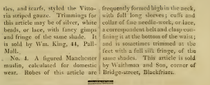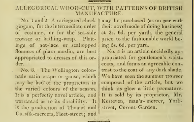 The celebration of Wellington’s Vittoria victory continues to be a theme in this month’s fabric sample #3, a “unique and elegant article for ladies’ robes, pelisses, mantles, and scarfs, styled the Vittoria striped gauze.” I wonder what the drapers might have said, if you asked them why it was a “Vittoria” striped gauze?