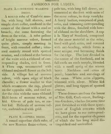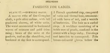 Both dresses are credited to one Mrs. Gill, Cork-street, Burlington-Gardens; for “the superior elegance” of her dresses she “has long stood distinguished and unrivalled.” A decidedly English name, Mrs. Gill. Perhaps all the Regency novels that portray the most sought-after dressmakers as French (or as pretending to be so) do not have it quite right?