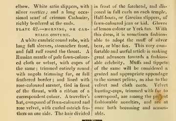 Autumn is remarkable for its diversity of fashions, our anonymous reporter notes, due to the changeful temperature of the season: “We not frequently observe the costume generally appropriated and adapted to the four quarters of the year, displayed in one day; so that the fair ovaries of the fantastic goddess have ample scope for their invention, as well as extensive encouragement for the exercise of their taste and genius.”