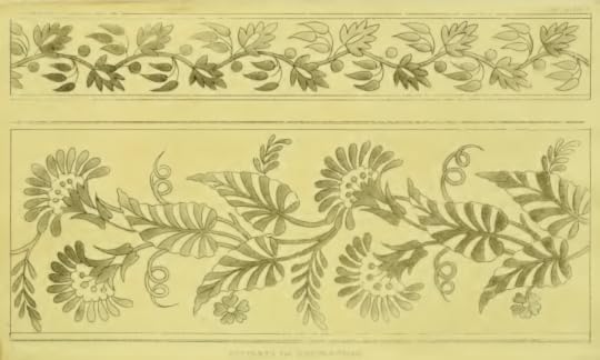 This month’s fabric samples include a piece which is not a fabric at all but rather a “beautiful fancy silver paper for ladies’ work-tables, boxes, card-racks, &c.” The actual sample, unfortunately, has deteriorated over time, and now appears mostly black. But its original form sounds quite intriguing: “When made up, it exhibits the appearance of the red sea-weed, strained on a white satin or silver ground.” I guess we will just have to picture it in our minds. Look to the sea-weed pattern of sample #2, a “sea-wood ground printed cambric,” to give you a jumping-off point for your imaginations…