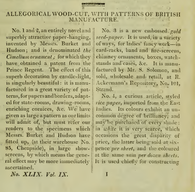 The paper, which comes in multiple colors, is recommended for fashioning paper flowers, which will “possess a superior degree of delicacy, and a nearer approach to nature” when constructed from such thin, translucent paper.
