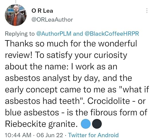 I can honestly say, I never expected the direction the novel took or the ending it had. Riebeckite took me by surprise and didn’t let go until the shocking conclusions. It was truly refreshing! I am so glad that it’s part of a series so I can dive back into O.R. Lea’s world of riebeckites and corporate intrigue and corruption.